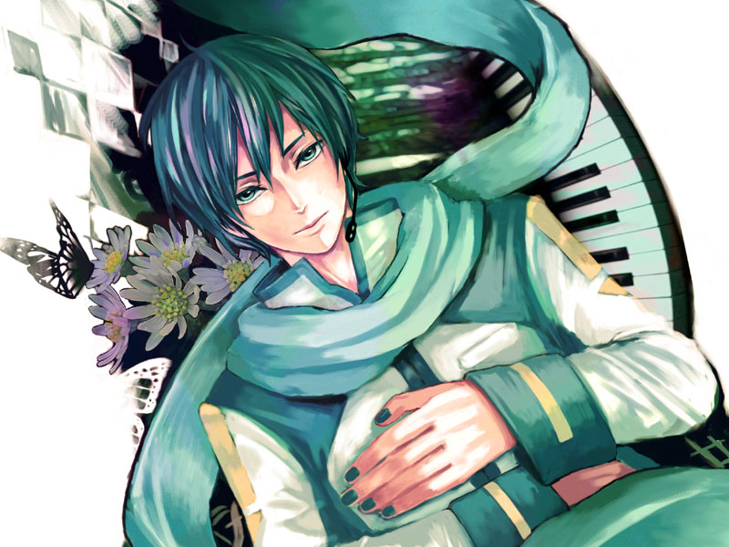 1boyaqua scarfblue eyesblue hairbugbutterflyflowerheadsetinsectinstrumentmale focusmatching hair/eyespianoscarfsolo