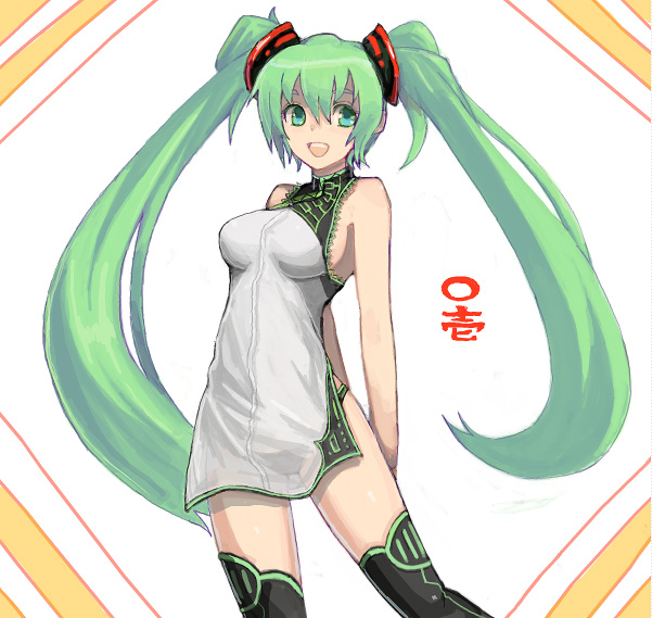 arms behind backbare shouldersbootschina dresschinese clothesdressgreen eyesgreen hairhair ornamentlong hairpantiessee-through clothessimple backgroundsmilesolothigh bootsthighhighstwintailsunderwearvery long hair