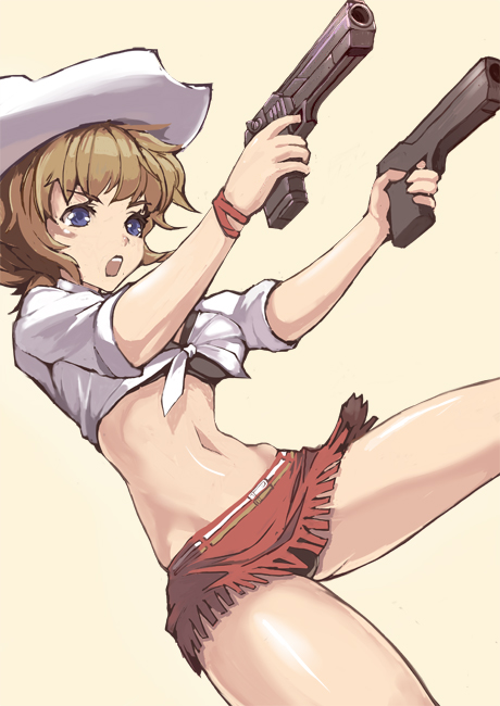 1girlblack brablack pantiesblue eyesbrabrown haircowboy hatcowboy westerndual wieldingfemale focusfringe trimfront-tie topgunhandgunhands on own hipshatholdinglingerieminiskirtpantiespistolshirtsimple backgroundskindentationskinnyskirtslendersolotied shirtunderwearupskirtweaponwristband