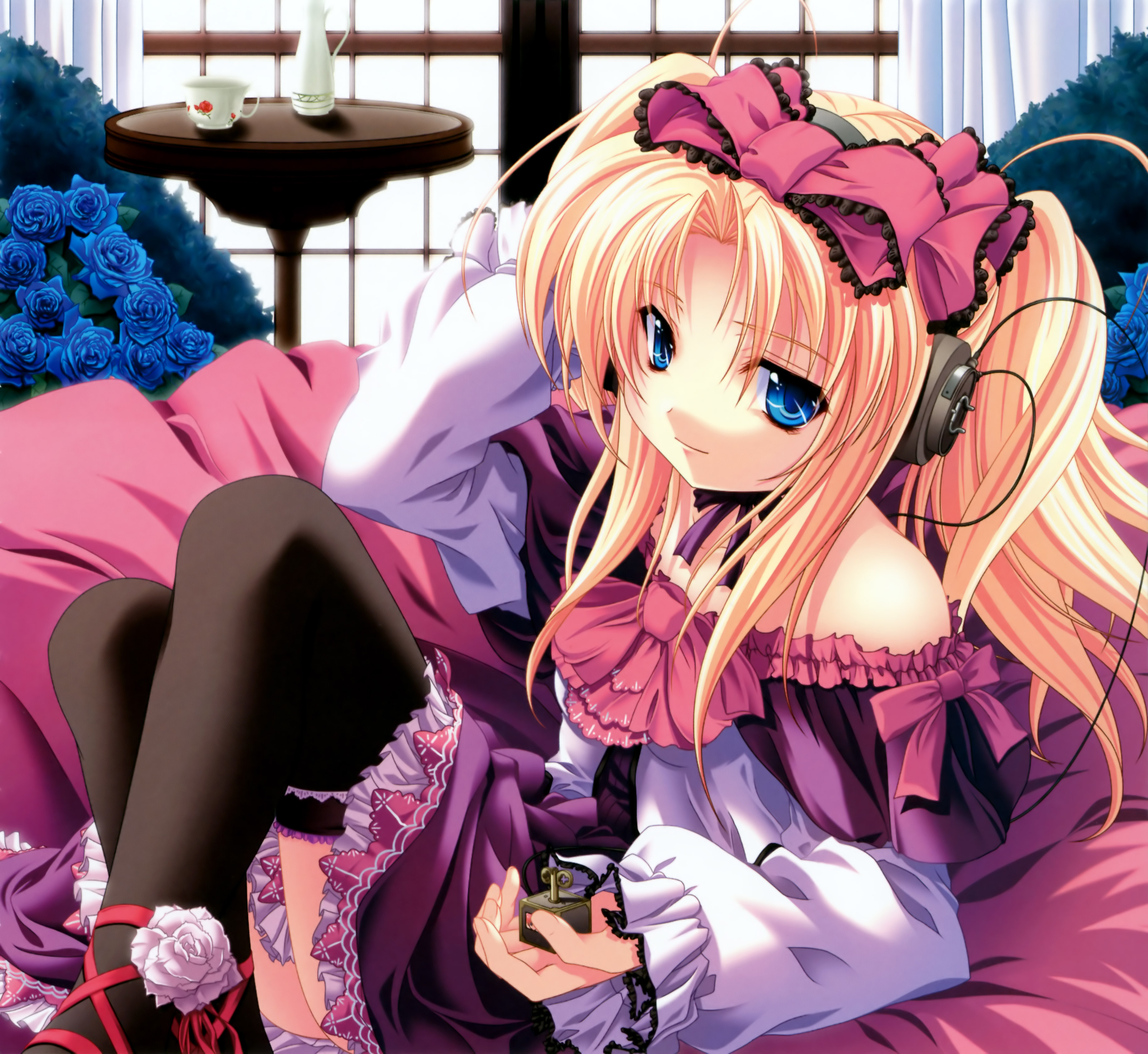 1girlankle flowerbare shouldersbedblonde hairblue eyesbowchokercupcurtainsdressfemale focusflowerfrillshair bowhair ribbonhand on own earheadphonesindoorslong hairlyingmusic boxpitcher (container)ribbonrosesittingsmilesolosunlighttableteacupthighhighstwintailsupskirtwide sleeveswindow