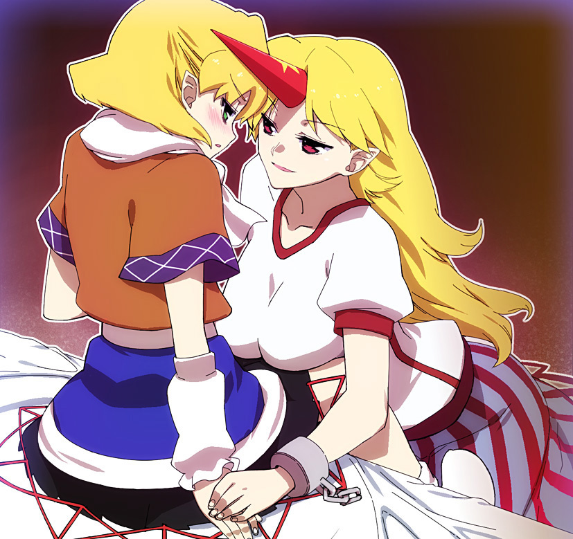 2girlsarm warmersblonde hairblushcuffsfemale focusgreen eyeshornslong hairmultiple girlspointy earsred eyesscarfshacklesshort hairsingle hornyuri