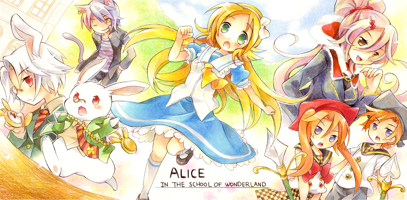 3boys3girlsanimal earsblonde hairbowbrown eyesclouddressearringsgreen eyesgrinhair ornamenthaircliphatjewelrymonoclemultiple boysmultiple girlsnecklacenecktieopen mouthpocket watchpolearmpurple eyespurple hairrabbitrabbit earsred eyesschool uniformskysmilespeartailtwintailswatchweaponwhite hairyellow eyes