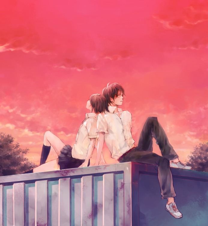 1boy1girlback-to-backblousecollared shirtcontainercouplecrateheteroradred skyschool uniformshipping crateshirtsittingskirtskyslice of lifewhite shirt
