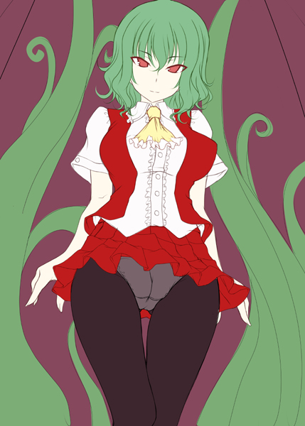 1girlascotbreastsfemale focusgreen hairpantiespanties under pantyhosepantyhosepantyshotred eyesskirtskirt setsolothigh gapunderwearupskirtvest