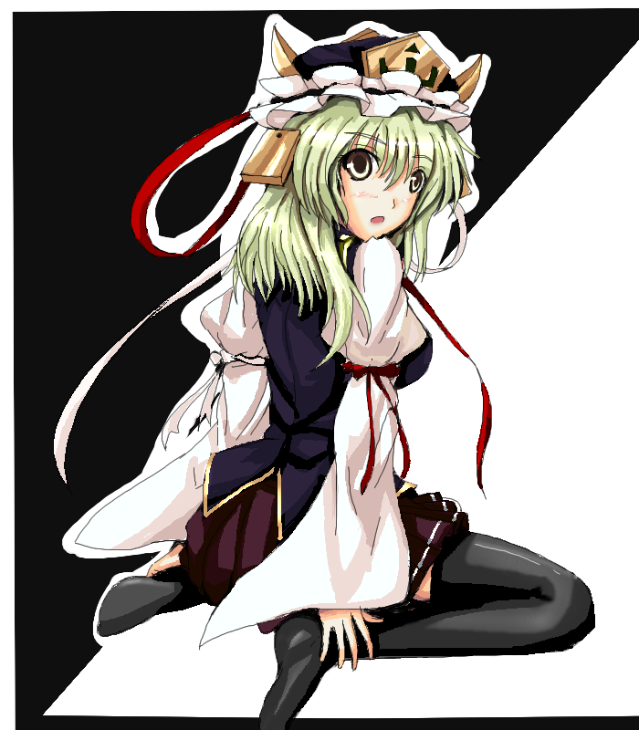 1girlblack backgroundblack thighhighsbreastsfemale focuskneelinglooking backoekakisittingsolothighhighswhite background