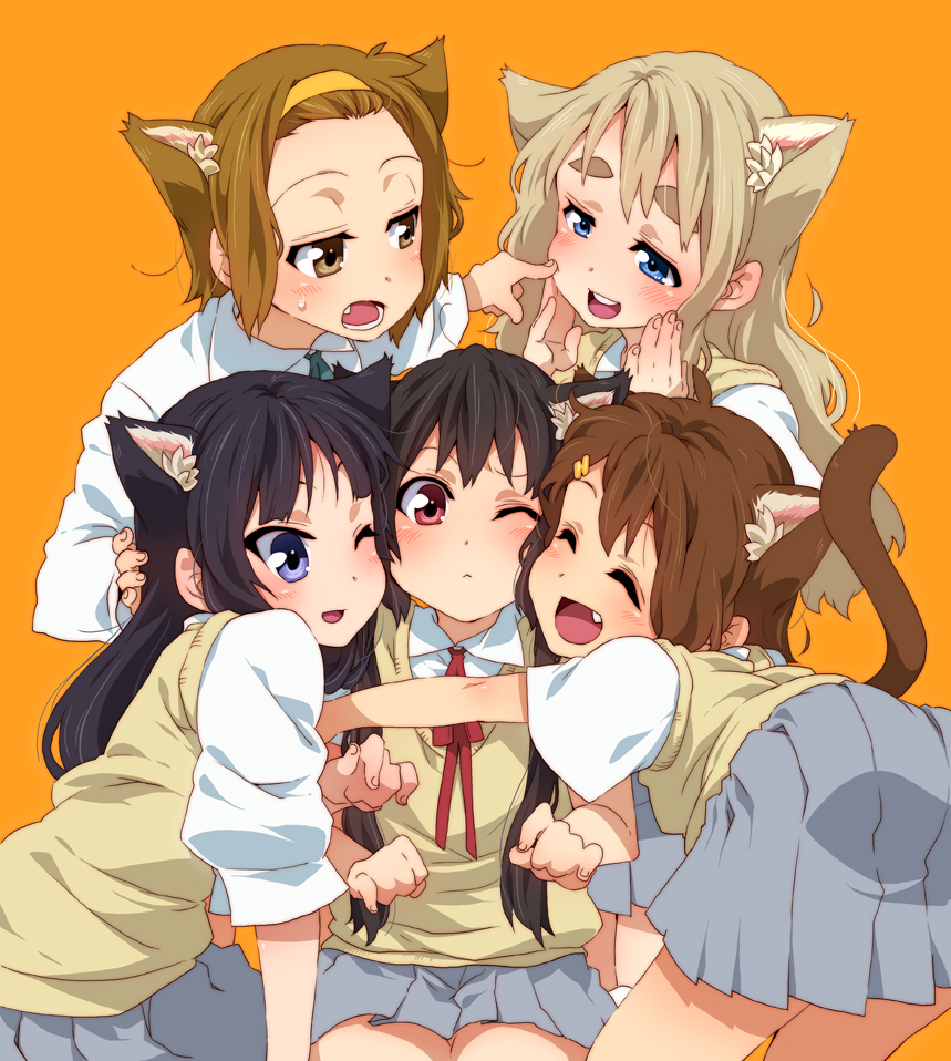 00s5girlsanimal earsblack hairblonde hairblue eyesblushbrown eyesbrown haircat earscat tailcheek pokingcheek-to-cheekclosed eyesfanghairbandhappyheads togetherho-kago tea timehuglong hairmultiple girlsone eye closedpokingred eyesschool uniformshort hairtailwink