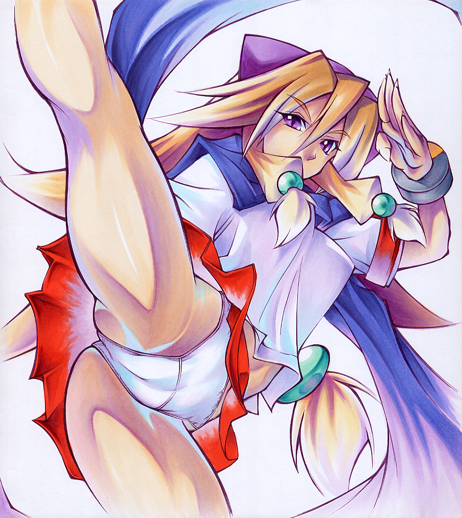 koin (foxmark), original, 1girl, antenna hair, arm support, blonde hair, blue panties, blush, female focus, panties, purple eyes, sitting, solo, striped clothes, striped panties, topless female, underwear, underwear only, wings