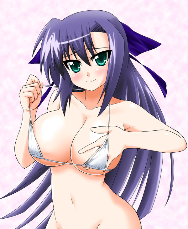 00s1girlbikiniblue hairblushbreastsfemale focusgrabbing own breastgreen eyeslarge breastslong hairpurple hairsoloswimsuitwhite bikini
