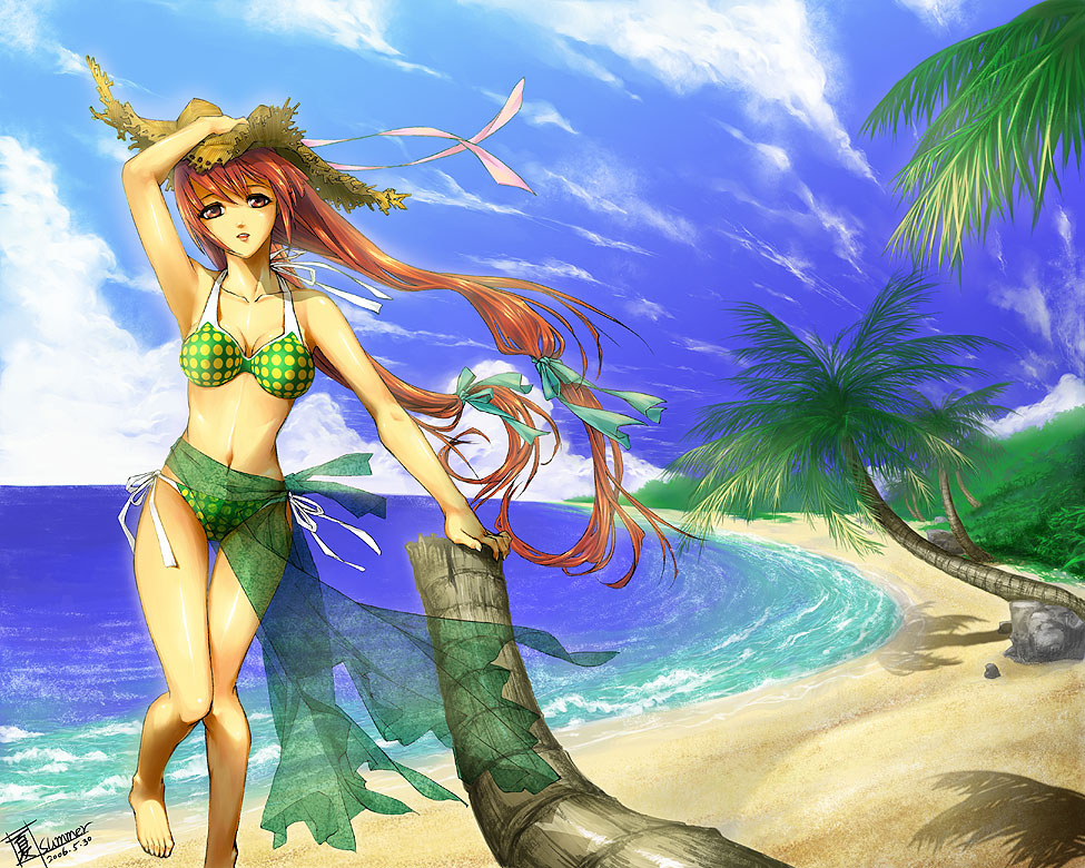 1girlbarefootbeachbikinidayfemale focusgreen bikinihair ribbonhatlong hairoceanoutdoorspolka dotpolka dot bikinipolka dot swimsuitred hairribbonsarongsee-through clothessee-through sarongside-tie bikini bottomskysolostraw hatswimsuitwaterwind