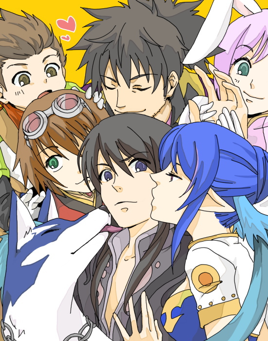 00s3boys3girlsanimal earsblack hairblue hairbrown hairchainclosed eyescoupledogeye contactglovesgogglesgreen eyesheartholding handskisskissing cheeklickinglong hairlooking at anothermultiple boysmultiple girlsopen mouthpink hairpointy earsponytailrabbit earsshort hairsmiletongue