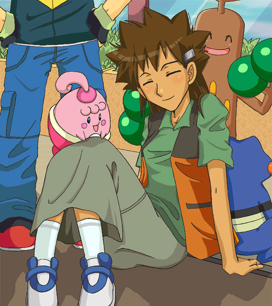 1boy1girlarm supportblousebrown hairbushchildclosed eyesdark skingen 2 pokemongen 4 pokemongenderswapgenderswap (mtf)green shirthair ornamenthaircliphands on own hipshead tiltlegs togetherpokemon (creature)shirtshoessittingsmilesneakersspiked hairstanding