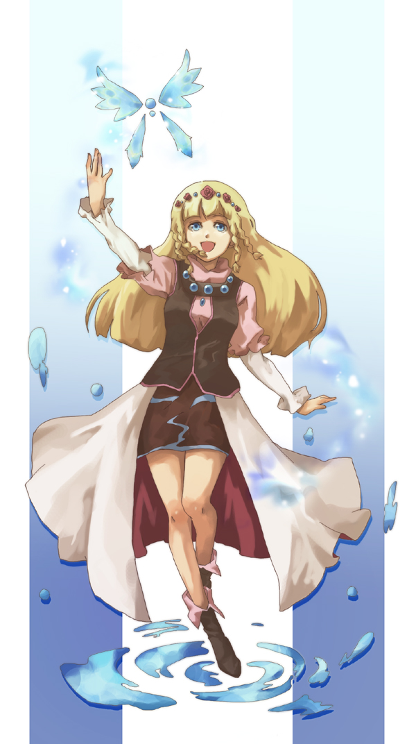 1girlblonde hairblue backgroundblue eyesbootsdressfemale focusknee bootslong hairsoloteriqueswater