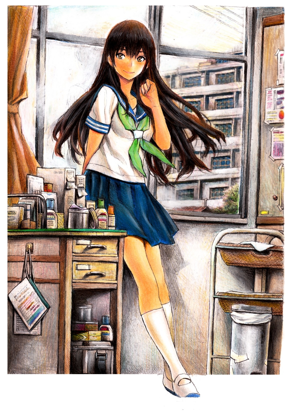 1girlbasketbrown eyesbrown haircolored pencilfemale focusinfirmarykneehighslong hairpencilpicture frameschool uniformserafukushoessockssolouwabakiwhite sockswindow