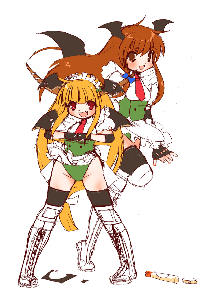 :d1boy2girlsbat wingsbrown haircosplayfangfemale focusfighting stancegluehead wingshorn ornamenthorn ribbonhornskoakuma (cosplay)long hairmultiple girlsnecktieopen mouthorange hairred eyesred hairred necktieribbonsketchsmiletapethighhighsv-shaped eyebrowsvery long hairwings