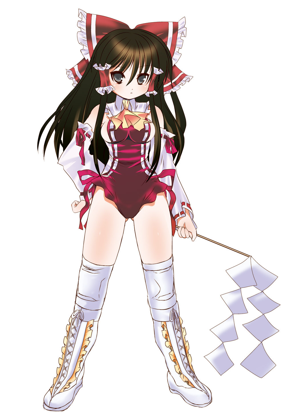1girlblack hairbootsbowdetached sleevesfemale focusgoheigrey eyeshair bowhair tubesholdingholding goheione-piece swimsuitred one-piece swimsuitsimple backgroundsoloswimsuitthigh bootsthighhighswhite background