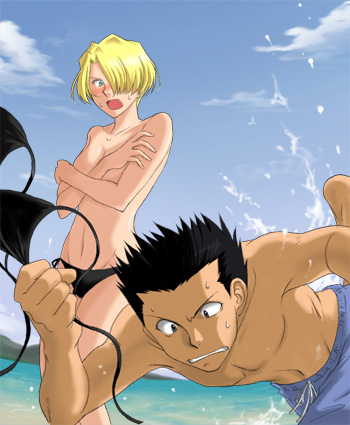 00s1boy1girlbikiniblonde hairblushbreastscovering breastscovering privatesdaygreen eyeshair over one eyeshort hairside-tie bikini bottomswimsuittopless femaletopless malewardrobe malfunctionwater