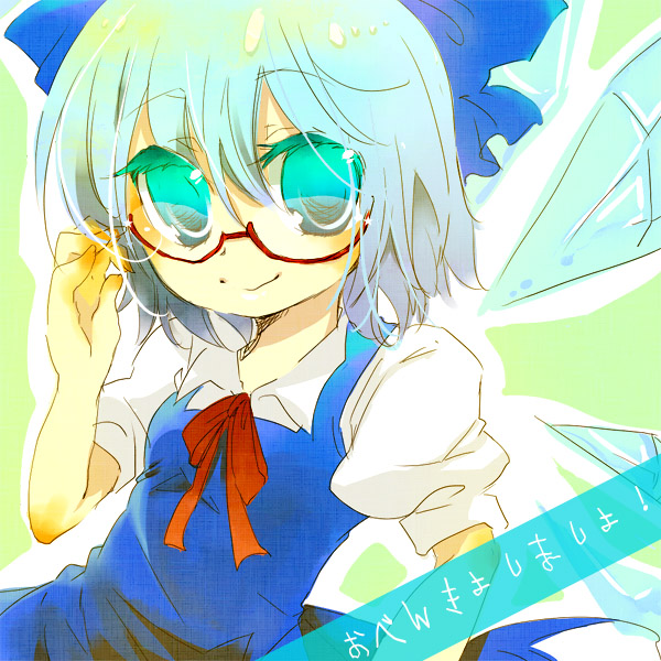 1girladjusting eyewearaqua eyesbespectacledblue hairfemale focusglassesno pupilssemi-rimless eyewearshort hairsmilesolounder-rim eyewearwings