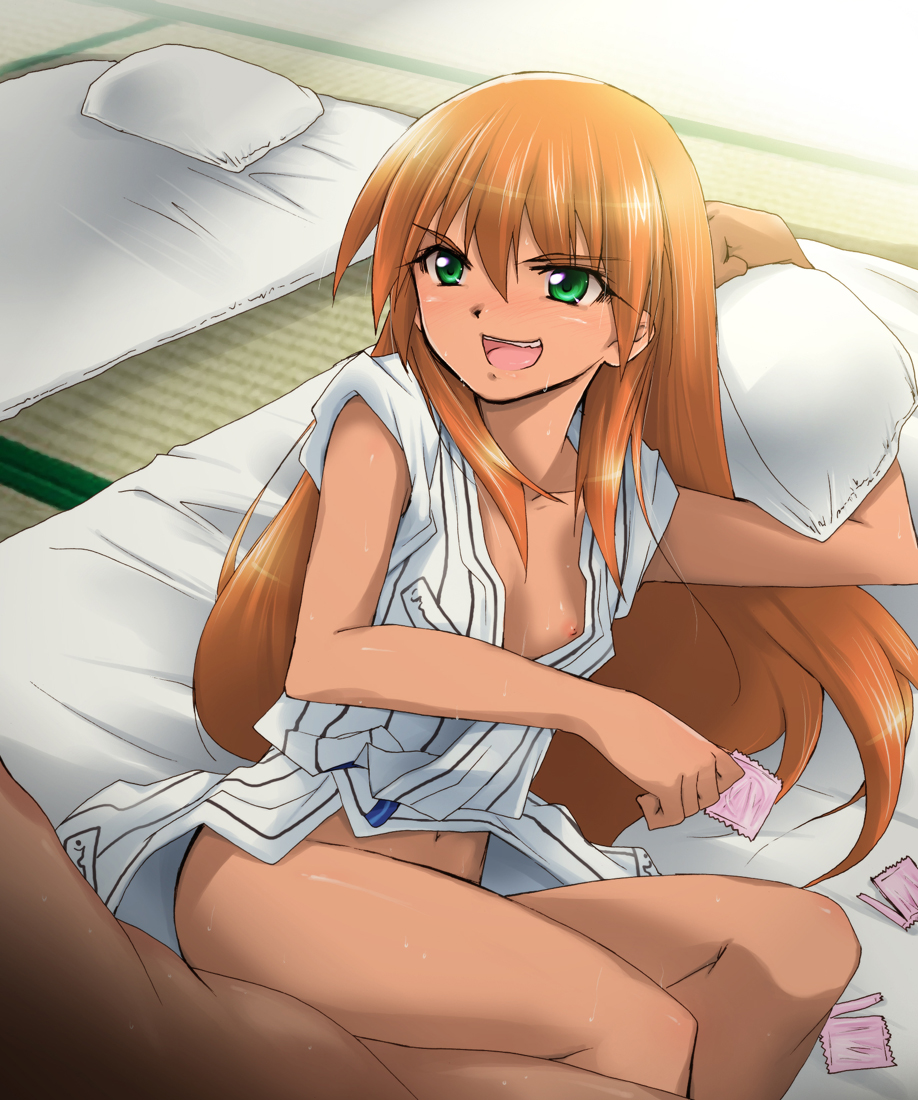 condom wrapperfaceless maleFlag for Deletionfutongreen eyessjapanese clotheskimonolong hairopen clothesopen kimonoorange hairpillowsexsweat