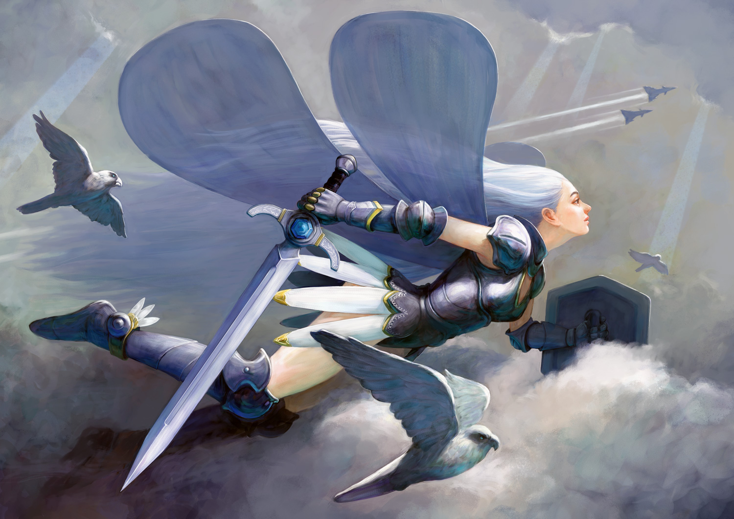 00sarmorbirdblue haircloudfairyfantasyflyinginsect wingslong hairshieldskysoloswordvery long hairweaponwings