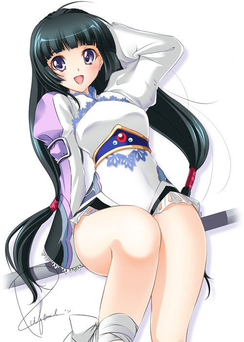 1girlahogeblack hairblue eyesfemale focuslong hairlong sleeveslow-tied long hairsignaturesittingsmilesolowhite background
