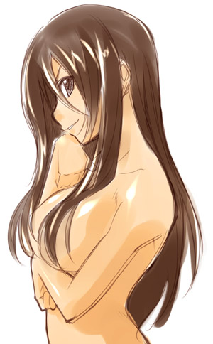 1girlbreastsbrown eyesbrown haircensoredconvenient censoringfemale focushair censorhair over breastslarge breastslong hairnudesimple backgroundsolowhite background
