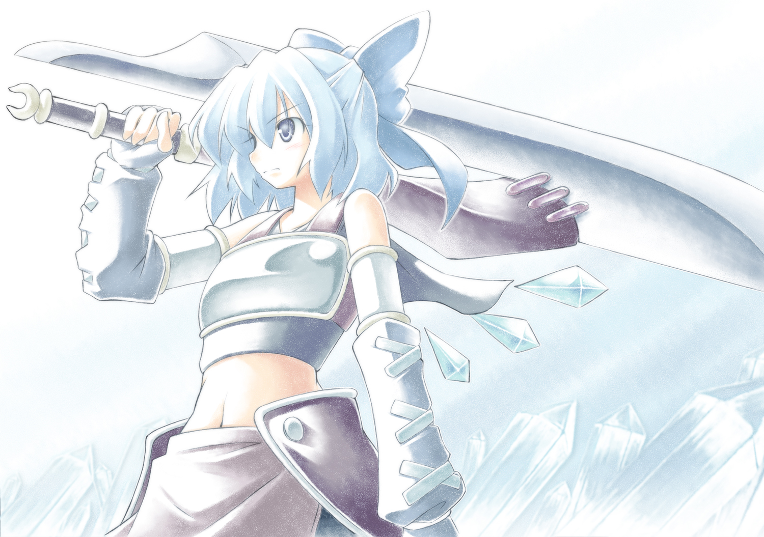 1girlarmorblue eyesblue hairdetached sleevesfemale focusgradient backgroundicematching hair/eyesmidriffnavelshort hairsoloswordweaponwhite backgroundwings