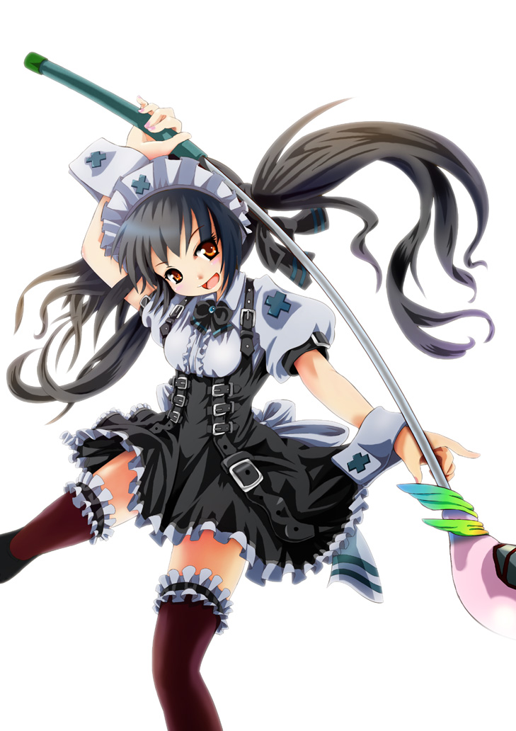 black hairchildfrilled thighhighsfrillsgolf clublong hairred eyessolothighhighswrist cuffszettai ryouiki