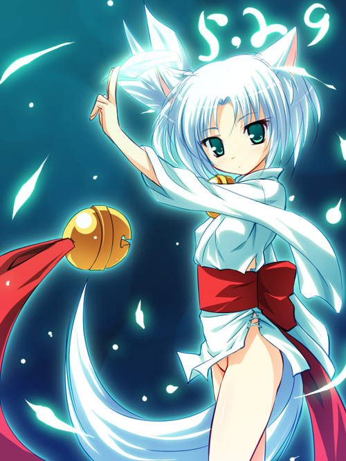 1girlanimal earsbellblue hairbottomlessfeathersfemale focusfox earsgreen eyesjapanese clotheslolino pantiesshort hairsolotail