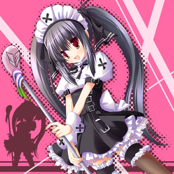 black hairfrilled thighhighsfrillsgolf clubhair ribbonlong hairred eyesribbonskirtsolothighhighstwintailszettai ryouiki