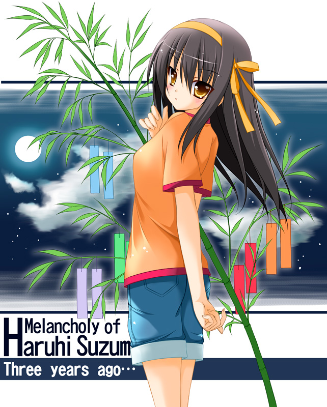 00s1girlaged downbamboobrown haircasualdenimdenim shortsfemale focushairbandlong hairmoonnightorange shirtshirtshortssolotanabatatanzaku