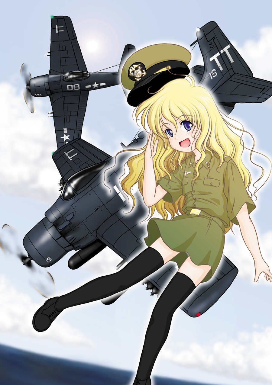 1girlaircraftairplaneblonde hairblue eyesfemale focushatmilitarymilitary uniformmilitary vehiclenaval uniformnaval working uniformpeaked cappropeller fightersalutesolothighhighsworld war ii