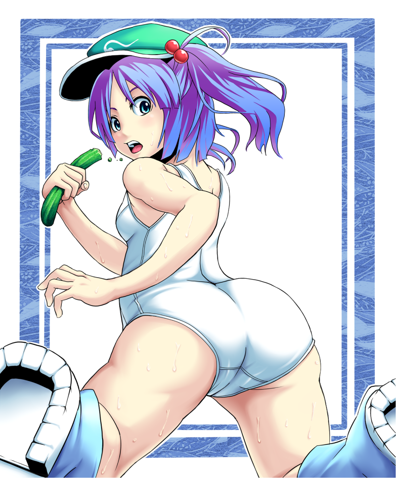 1girlassblue eyesblue hairbootscameltoecucumbereatingfemale focushair bobbleshair ornamenthatlooking backmatching hair/eyesone-piece swimsuitschool swimsuitshort hairsolosurprisedswimsuittwintailstwo side upwet