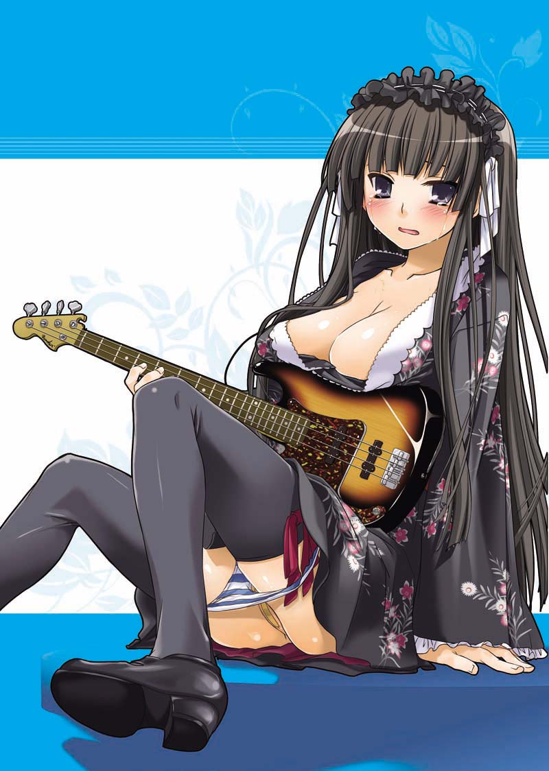 00s1girlbandaidbandaid on pussybass guitarblack hairblack shoesblack thighhighsblushbreastscleavagedownblousefemale focusfloral printhairbandinstrumentjapanese clothesknees uplolita hairbandmaebaripantiespanty pullpurple eyesshoessittingsolostriped clothesstriped pantiestearsthighhighsunderwear