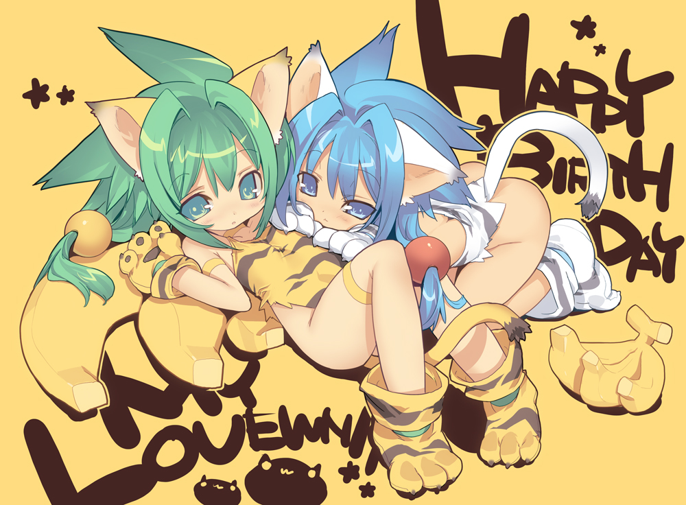 2girlsalternate coloranimal earsanimal handsanimal printbananablue eyesblue hairblushbottomlesscat earscat tailchilddual personafoodfruitglovesgreen eyesgreen hairhair ornamentlyingmultiple girlspaw glovespaw shoesplayer 2shoestailtiger print