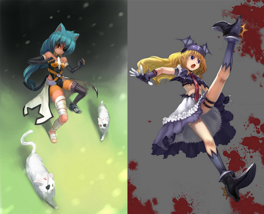 animal earsbandagesblonde hairblue eyesblue hairbootscatdark skindark-skinned femaleelbow gloveseyepatchfighting stancegloveshatkickinglong hairskirttailthigh strap