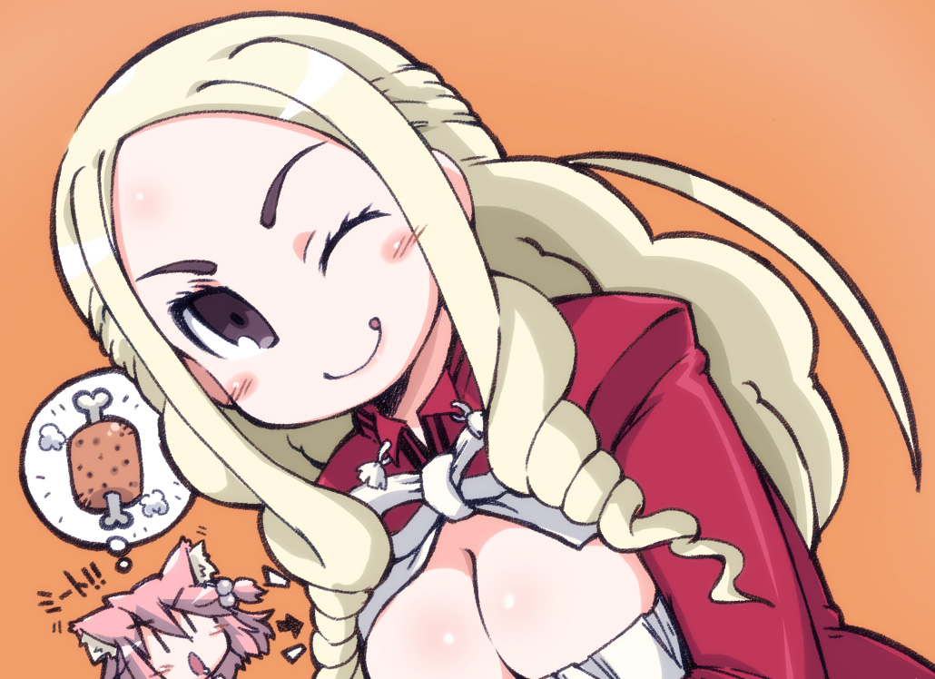 :p:q1boy2girlsanimal earsblonde hairblushbowbowtiebreastsbrown eyescat earscleavagedrill hairfoodhair ornamentlarge breastslong hairmultiple girlsone eye closedopen mouthpink hairshort hairsimple backgroundsmiletonguetongue outwink