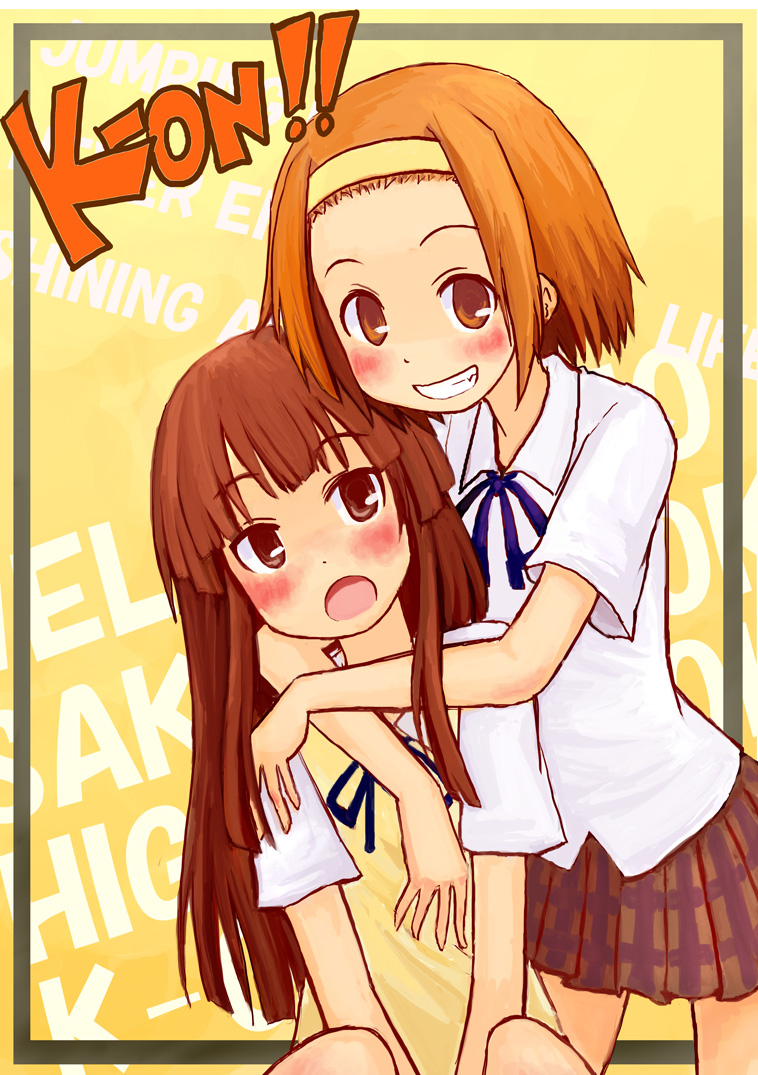 kutatsu (kutatsu7), original, absurdres, commentary request, highres, 2girls, black hair, blue bow, blue bowtie, blue skirt, blush, bow, bowtie, breasts, brown eyes, brown hair, closed mouth, hair between eyes, hair ornament, hairclip, long hair, looking at viewer, mole, mole under eye, multiple girls, open mouth, pleated skirt, ponytail, sailor collar, school uniform, shirt, short sleeves, simple background, skirt, small breasts, smile, white background, white sailor collar, white shirt, yuki (kutatsu)