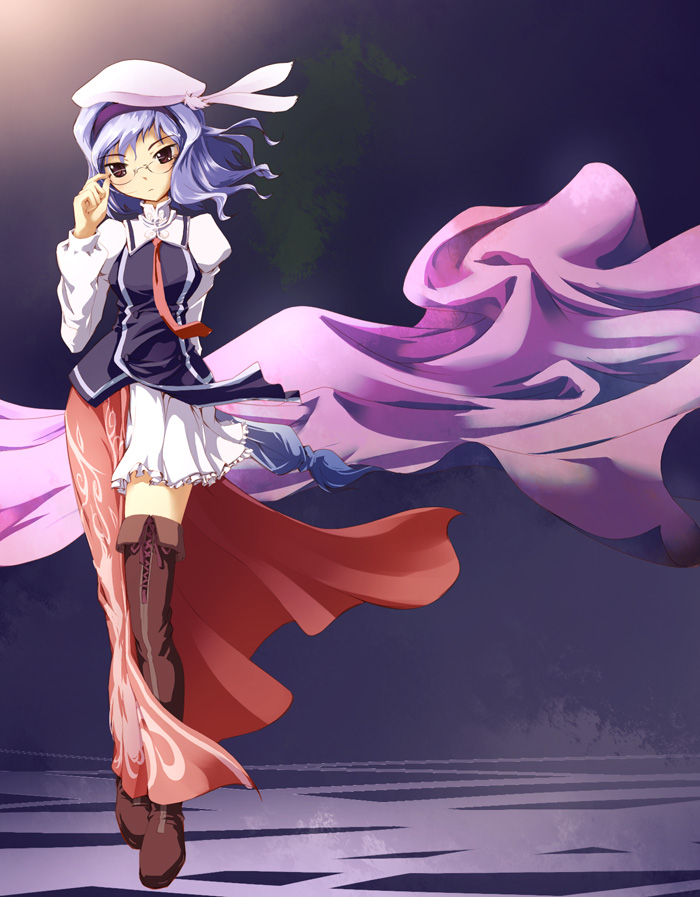 adjusting eyewearberetblue hairbootsbraidbrown eyesfeathersglasseshairbandhatlong hairnecktieskirtsolothigh bootsthighhighsvery long hairwindzettai ryouiki