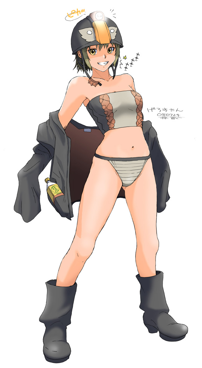 1girlbootsbottlegreen hairhelmetjacketpantiespersonificationsmilestriped clothesstriped pantiesunderwearyellow eyes