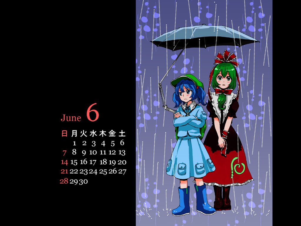 2girlsbackpackbagblue eyesblue haircalendarcrossed armsfemale focusfront ponytailgreen eyesgreen hairhair bobbleshair ornamenthair ribbonhatjunemultiple girlsrainrandoseruribbonshort hairtwintailstwo side upumbrella