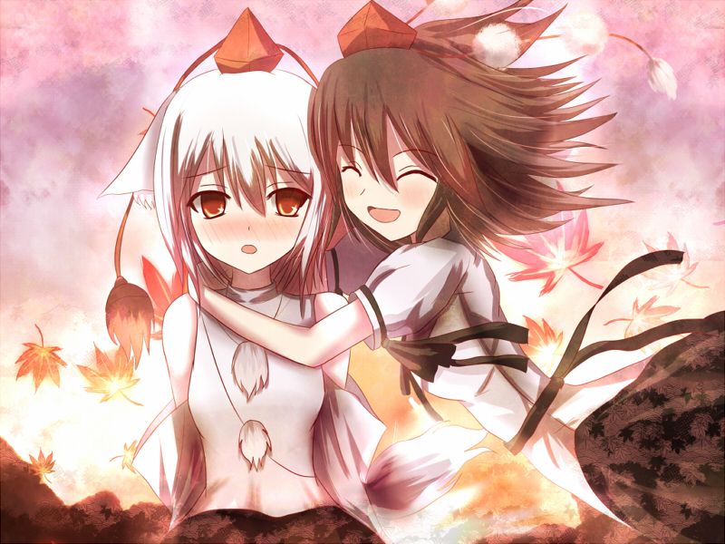 2girlsanimal earsblack hairblushdetached sleevesfemale focushathugleafmultiple girlstokin hatwhite hair