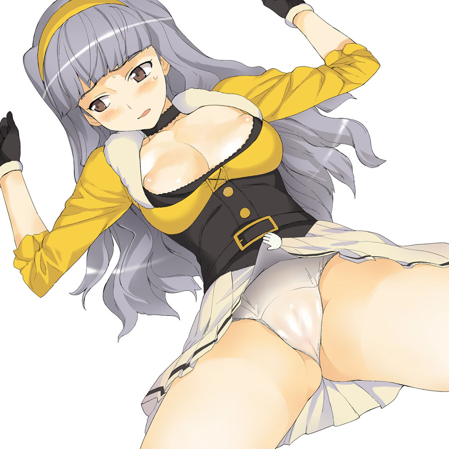 00s1girlbreastsclothes liftfemale focushairbandlarge breastslong hairnipple slipnipplespantiessimple backgroundskirtskirt liftsolounderwearwhite background