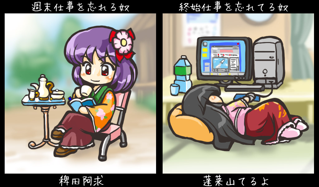 2girlsblack hairbookbottlechibicomputercomputer keyboardcupfemale focusflowerindoorslong hairlyingmonitormultiple girlsneetoutdoorsplantpurple eyesred eyessittingskyteateacupteapottree