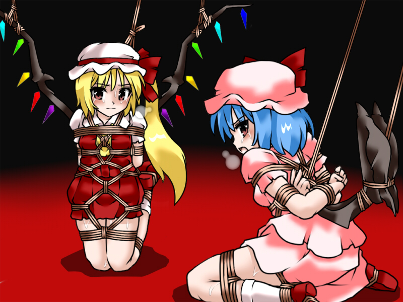 2girlsarms behind backbdsmblonde hairblue hairblushbondageboundbound legsbound wristsbox tiebreast bondagefemale focusfrogtiehogtielong hairmultiple girlsopen mouthred eyesropeshibarishort hairsiblingssisterssweattearswings