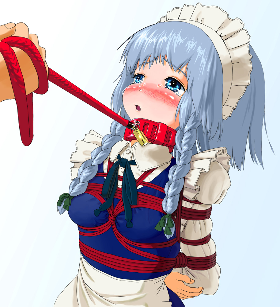 1girlaqua eyesarms behind backbackbdsmblue eyesblue hairblushbondageboundbound armsbox tiebraidbreast bondagebreastscollarfemale focusleashlockmaidmaid headdressmatching hair/eyesropeshibarishibari over clothessimple backgroundsolotearstwin braids