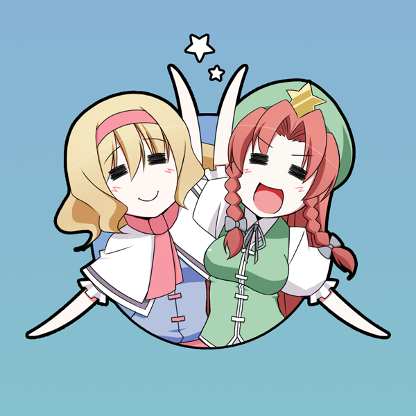 1boy2girlsblonde hairbraidbreastsfemale focushairbandhatmultiple girlsred hairsmiletwin braidsupper body