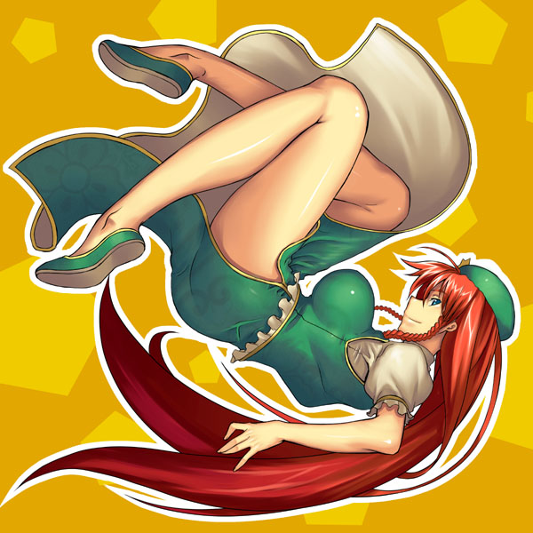 1girlberetblue eyesbraidbreastschinese clothesfemale focusflatshatlarge breastslong hairred hairside slitsideboobsmilesolovery long hair