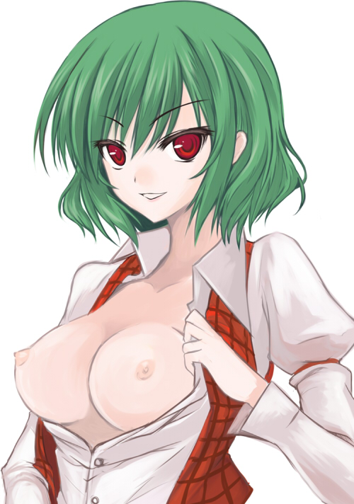 1girlbreastsfemale focusgreen hairlarge breastsnipplesopen clothesopen shirtplaid clothesplaid vestred eyesshirtshort hairsmilesolotsurimeupper bodyvest