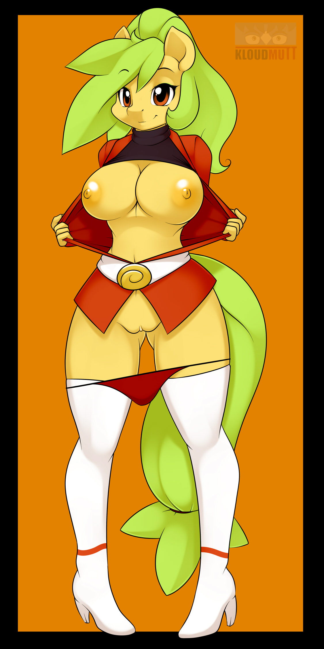 amber eyesareolabig breastsbootsbreastsclothedclothingequinefemaleFlag for Deletiongreen hairhairheelshigh heelshorselong hairlooking at viewermammalnipplesopen shirtpantiespanties downponypussyred pantiesshirtshirt liftskirtskirt liftsmilesolospread legsstandingthigh high bootsthighhighsthighsunderwearundressingwide hipsyellow nipplesyellow skin