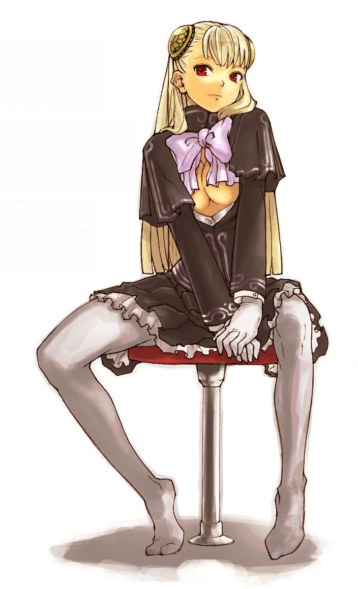 1girlblonde hairbreastscleavagecleavage cutoutclothing cutoutfeetfemale focusgloveshairpodslegslipspantyhosered eyessolowhite pantyhose